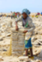 An Afar salt farmer stacks 5kg blocks of salt ready to be loaded onto a camel for the 3 hour trip back to the local village.